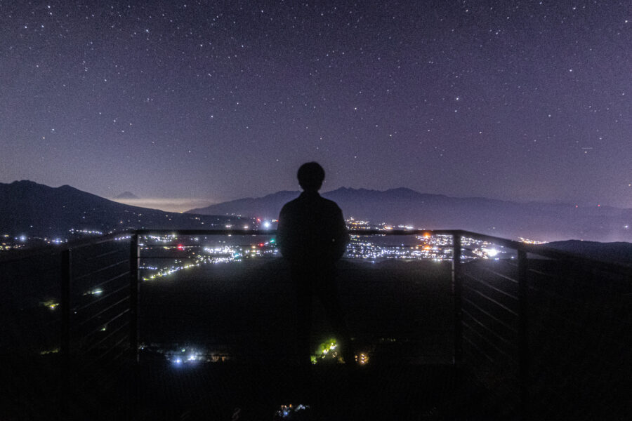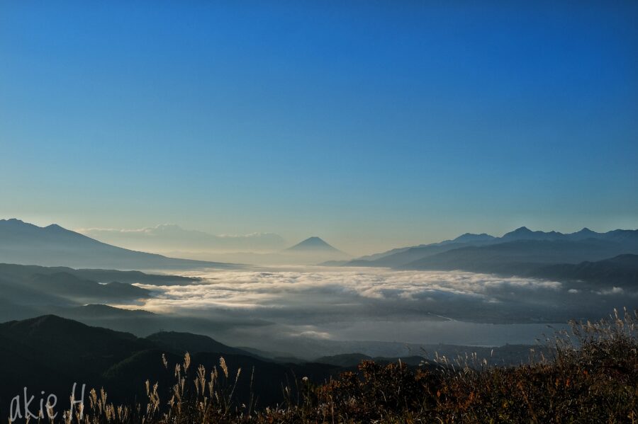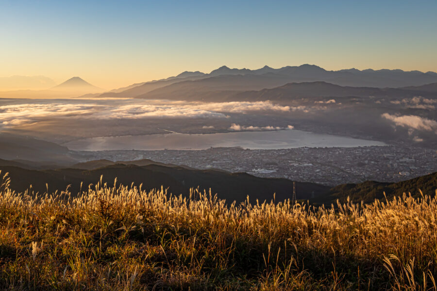 この写真、下に見える湖が諏訪湖雲海の奥に見えるのが富士山、という贅沢な場所です。