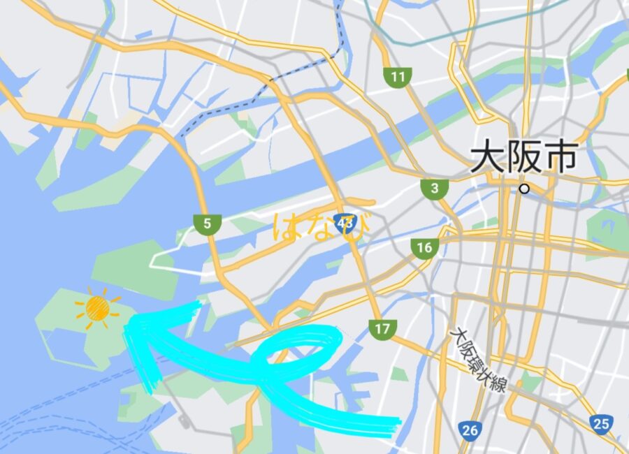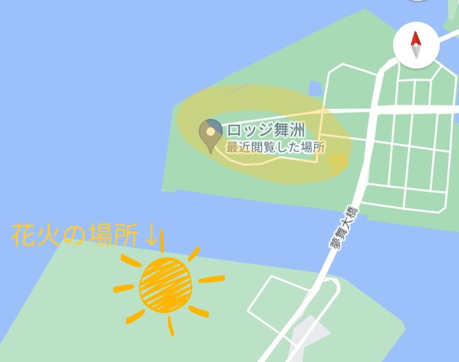 花火の位置はここ、万博開催地「夢洲」の北側。