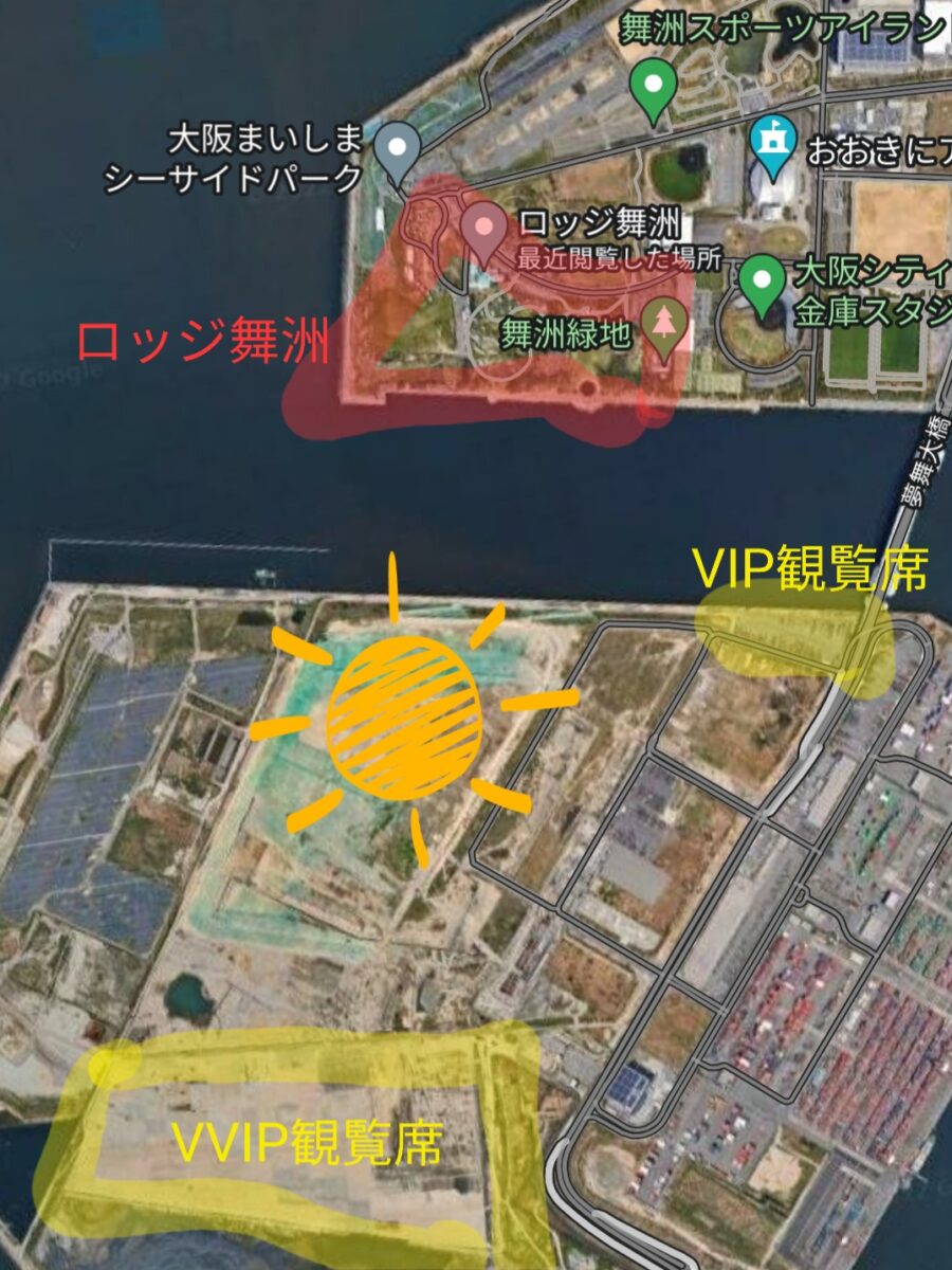 夢洲の周りはすべて関係者限定の有料観覧席です。