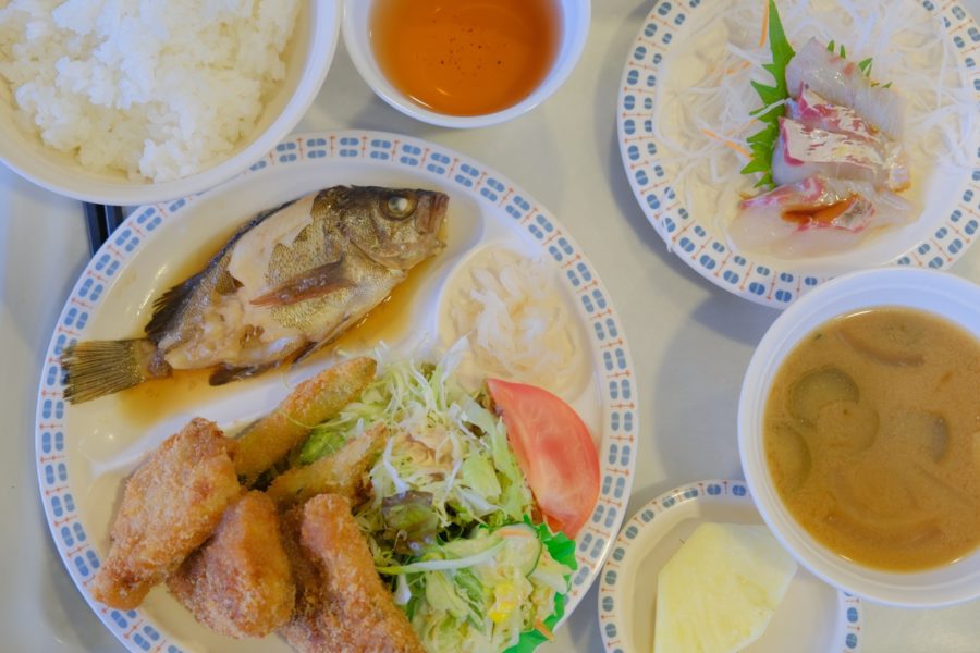 その施設で採れた鯛のお刺身にメバルの煮付けといったご当地の新鮮な素材を使った定食をいただきます。