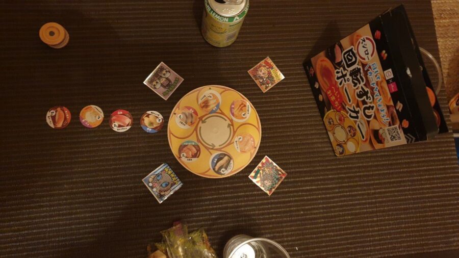 そして最後にT氏が購入した100均ゲーム「回転ずしポーカー」で寝床争奪戦!